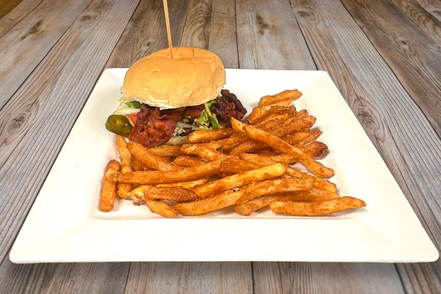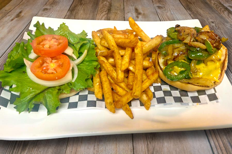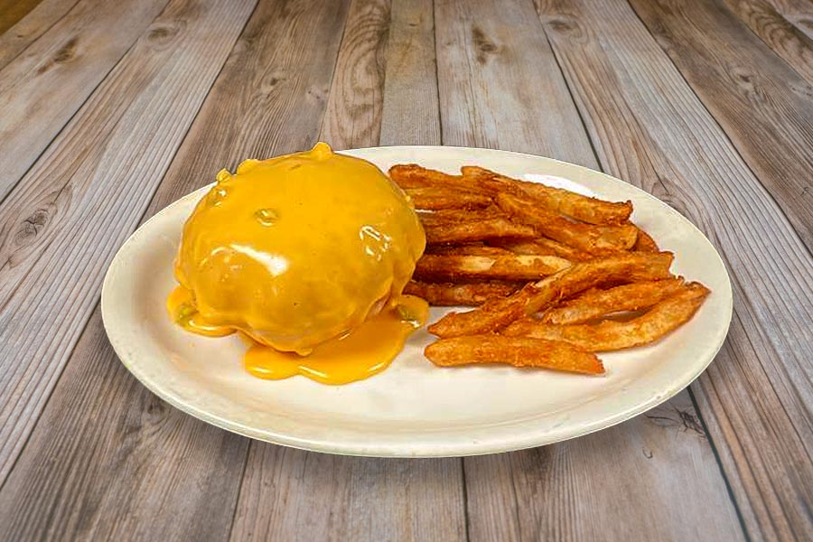Jalapeño Cheese Burger10.996 oz. Hamburger patty, topped with cheese and jalapeños, lettuce, tomatoes, and onions. Served with french fries Only. -