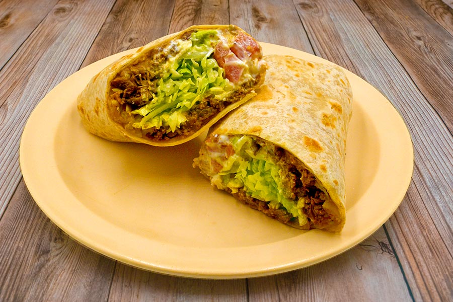 Tex Mex BurritoLarge Flour Tortilla Filled with Ground Beef or Shredded Chicken with Chile con Queso. Topped with Enchilada Gravy.