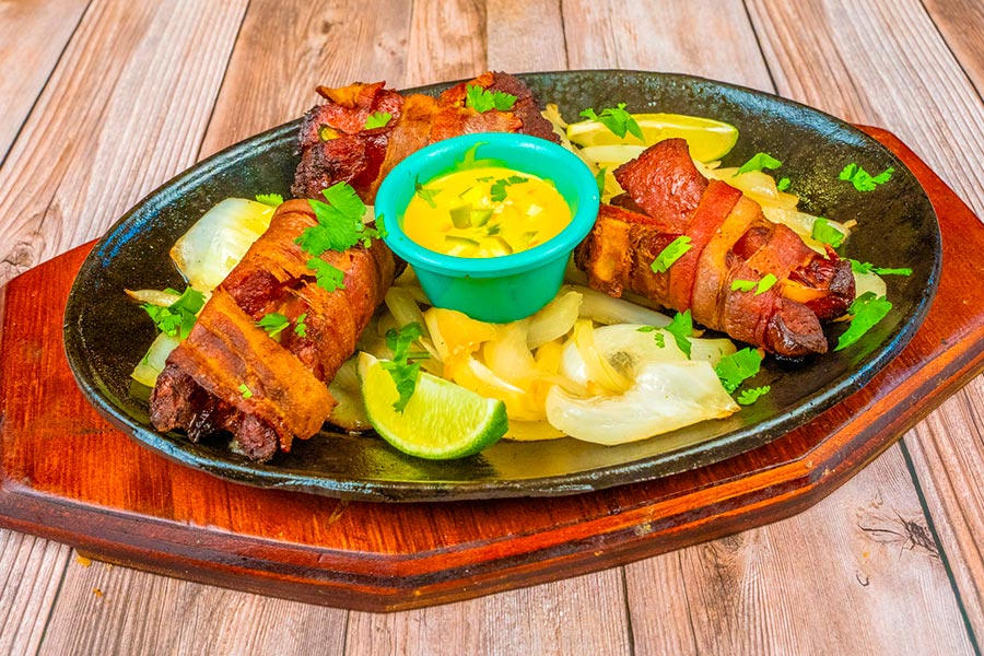 Sausage Diablo18.99Three sausage or Chicken Diablo stuffed with jalapeños and Monterrey cheese, wrapped with bacon. Served on a hot skillet with jalapeño chile con Queso, grilled onions and bell peppers.